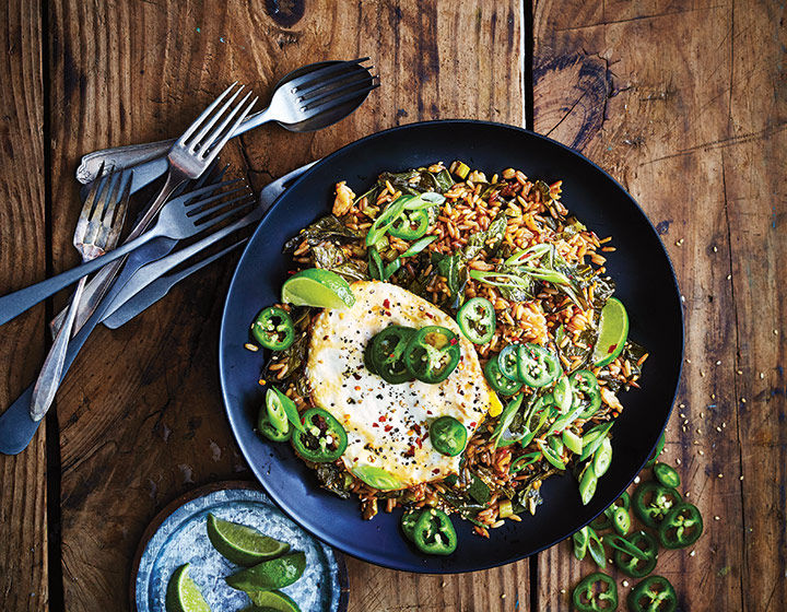 1 bunch young collard greens (1/2 pound) 2 tablespoons vegetable oil 2 large eggs 1 teaspoon kosher salt 1/2 teaspoon freshly ground black pepper 1/2 onion, diced 2 garlic cloves, smashed and thinly sliced 1 (1-inch) piece fresh ginger, peeled and grated (about 2 teaspoons) 3 tablespoons rice wine vinegar 2 tablespoons reduced-sodium soy sauce 1 tablespoon mirin 2 cups cooked rice 1 teaspoon sesame oil 4 scallions, thinly sliced 1 jalapeño chile, very thinly sliced 1 teaspoon sesame seeds 1 lime, cut into 8 wedges Red pepper flakes (optional)